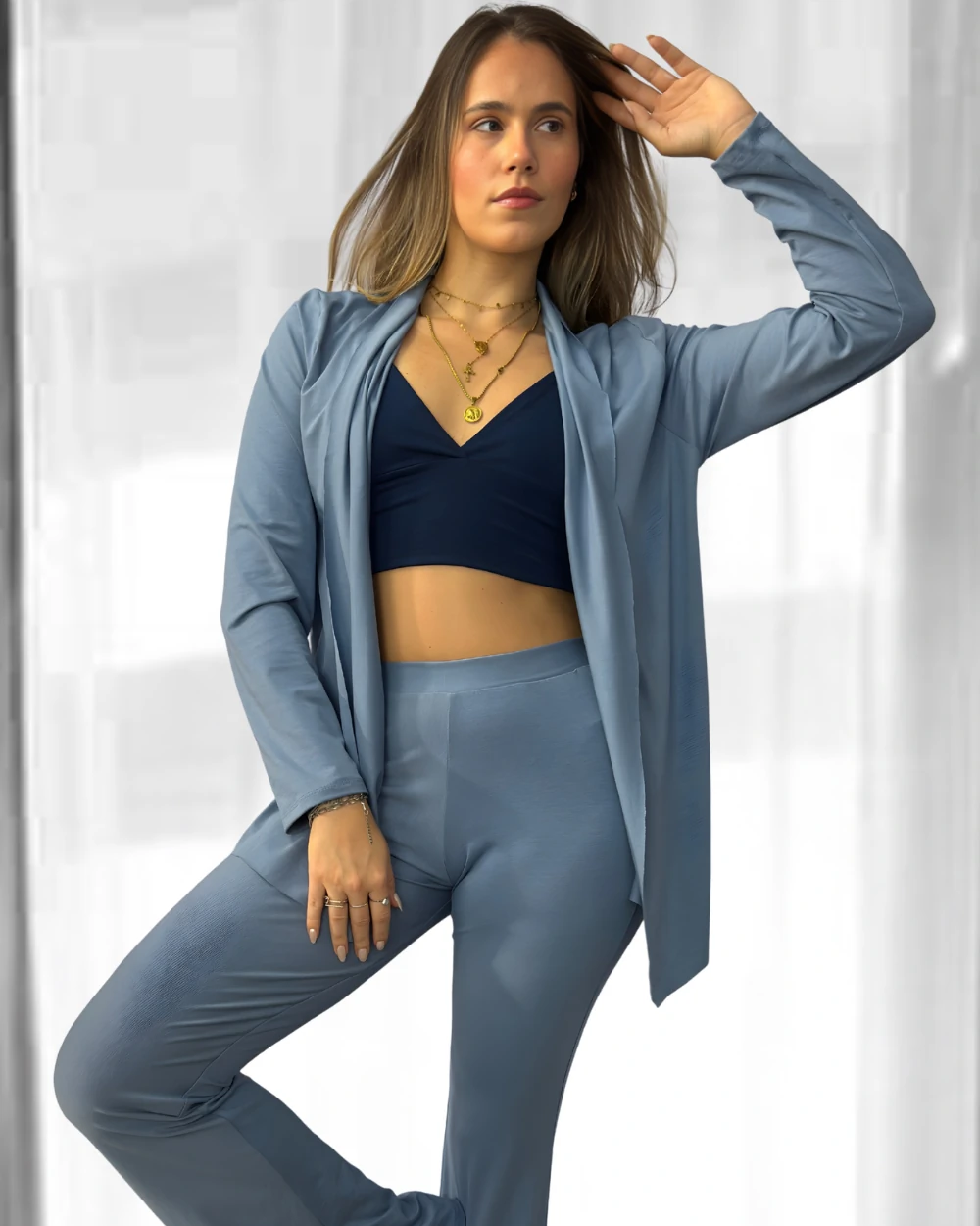 - Harmonia de tecidos: o contraste delicioso entre a Viscose com Elastano da calça e do cardigan e a suavidade da Viscolycra do top.