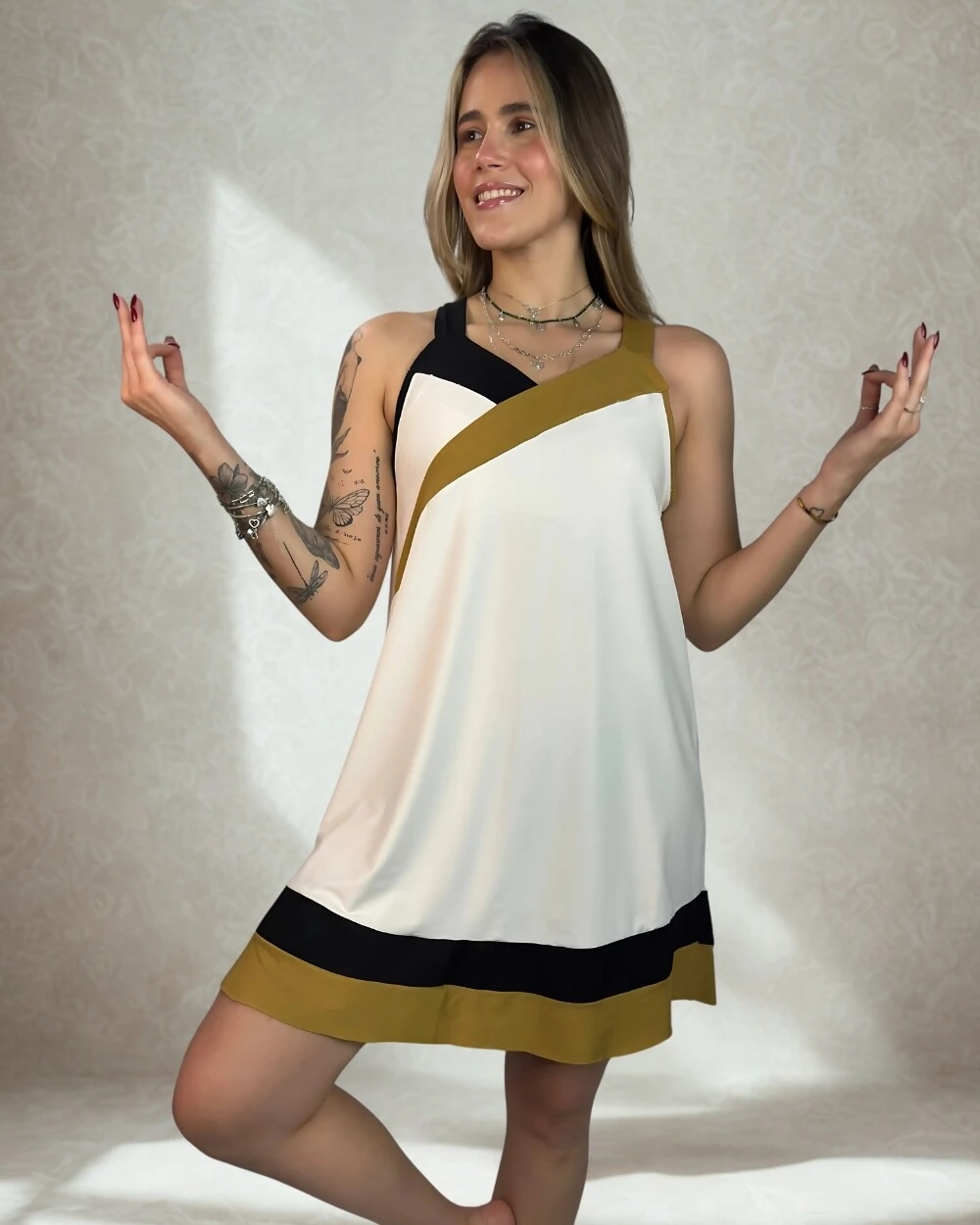- Decote transpassado bicolor: um detalhe refinado que valoriza o colo, adicionando um toque de modernidade e contraste ao visual.