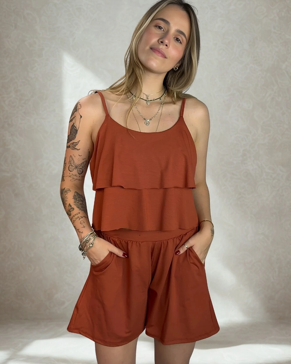 Apresentamos o Conjunto Frescor, uma combinação perfeita de conforto e estilo, ideal para os dias quentes da primavera. Composto por um shorts de modelagem godê e uma bata de alças com babados, este conjunto é a escolha certa para mulheres que buscam leveza e elegância em uma única peça.
