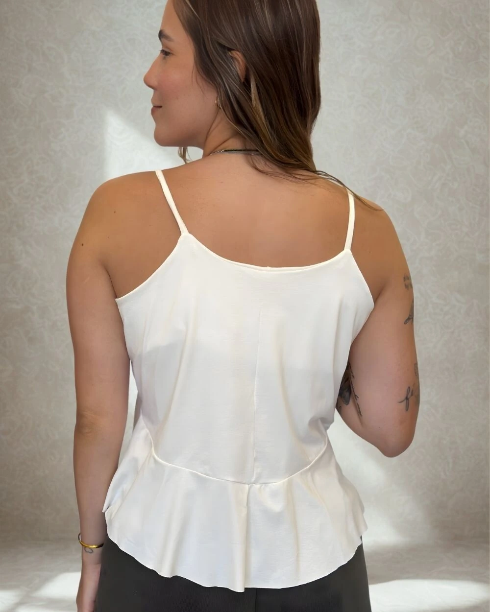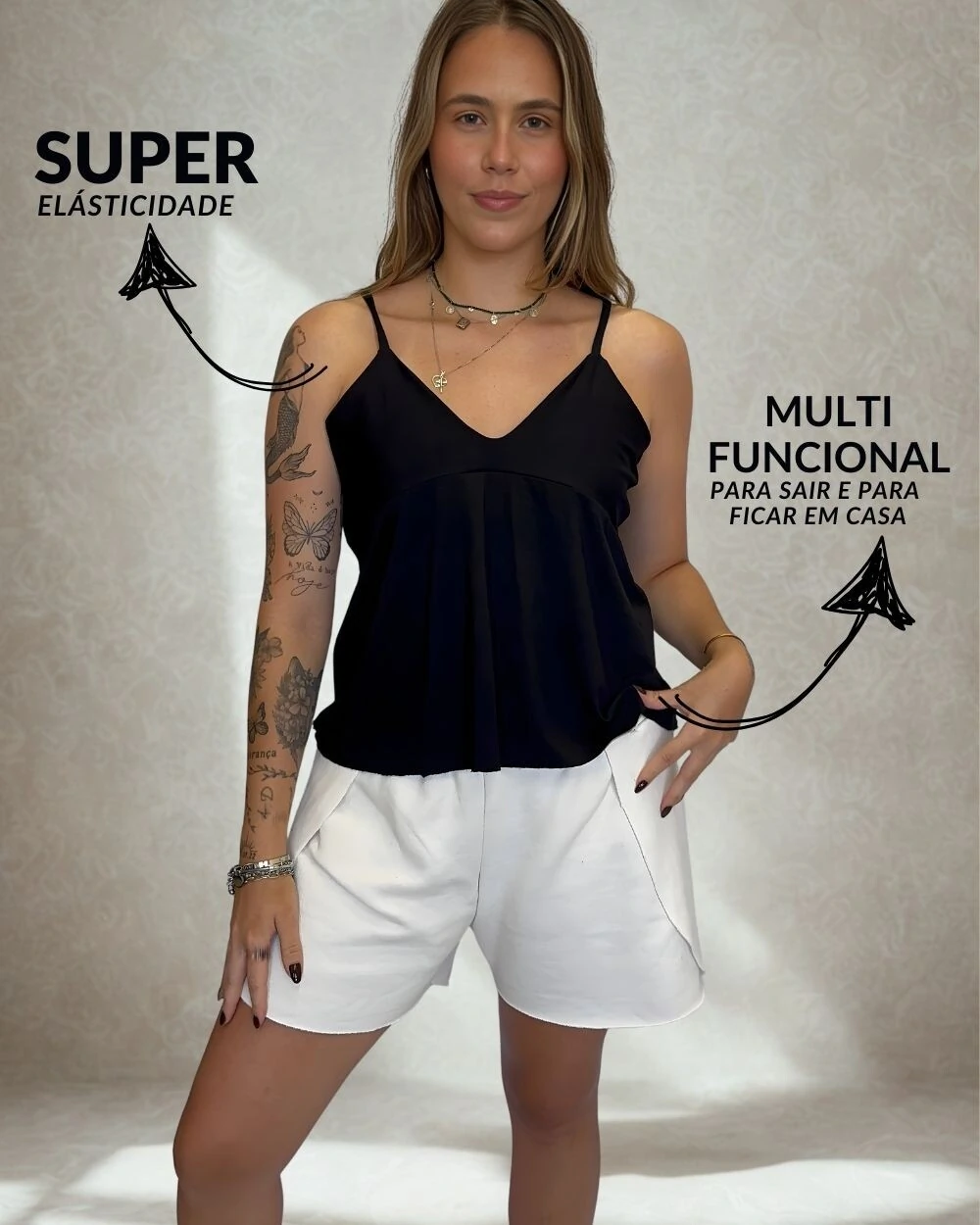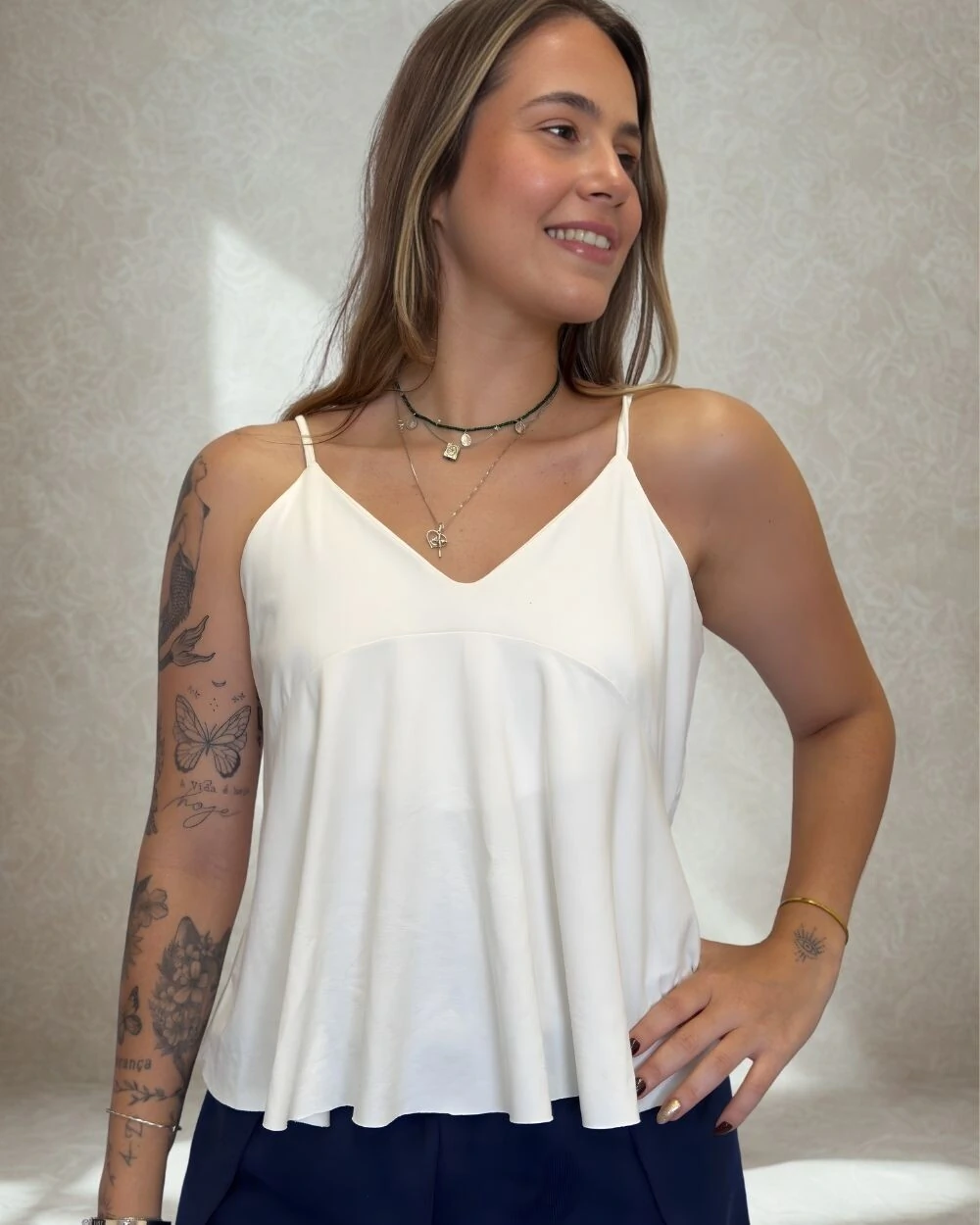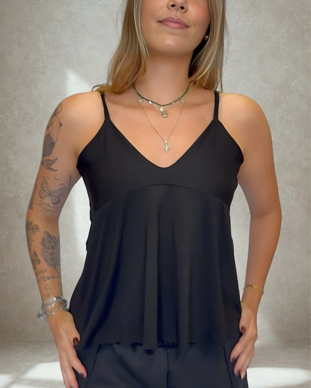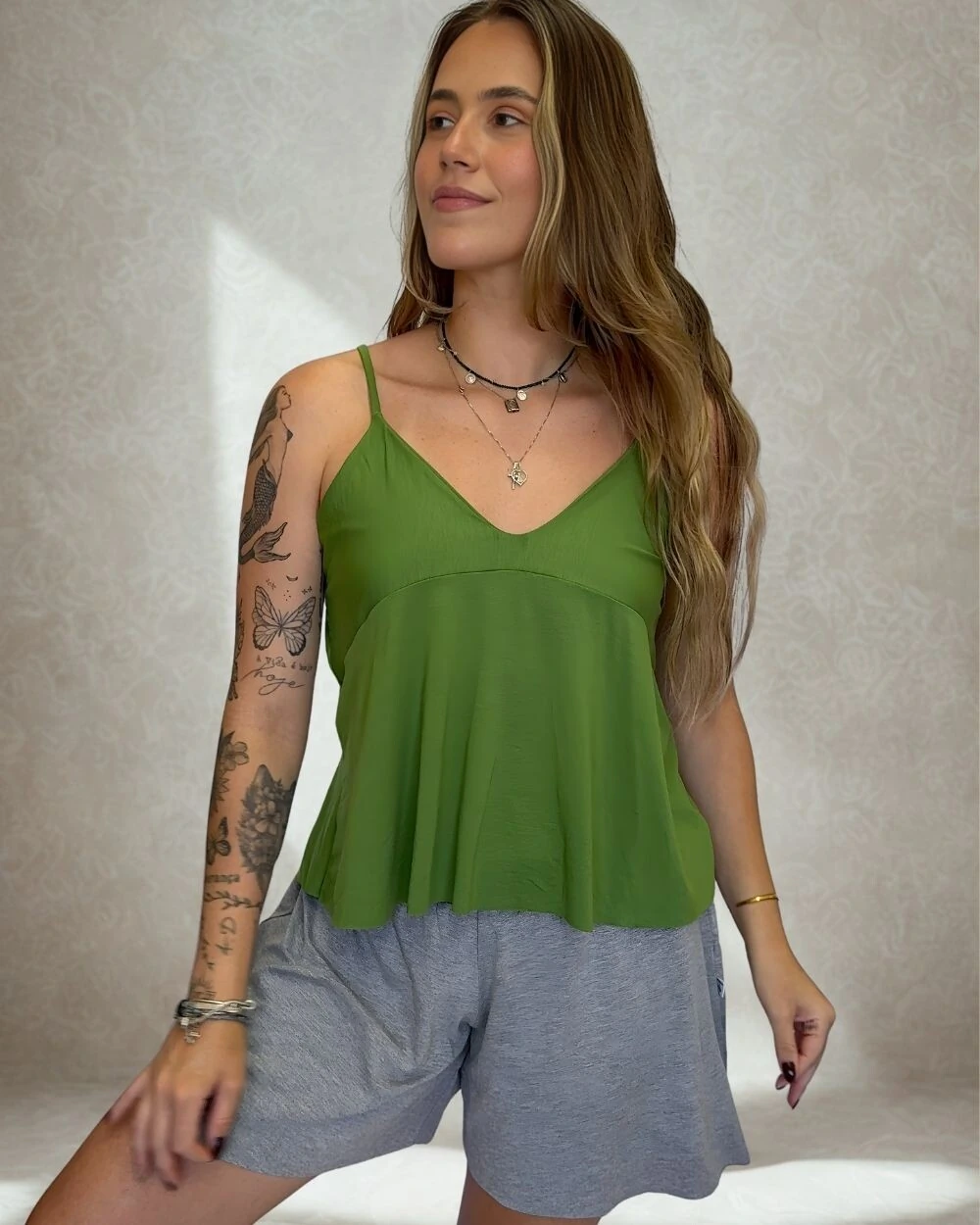 - Decote V com alças confortáveis: o decote em V confere um toque delicado e feminino, complementado por alças que oferecem suporte ideal e um visual arejado.