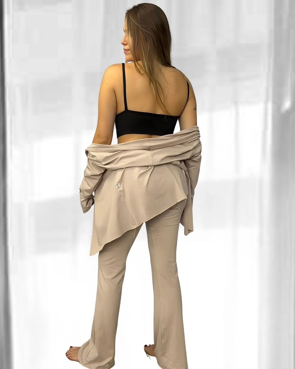- Versatilidade absoluta: o conjunto nude funciona como tela neutra para infinitas combinações, e o top preto é a peça essencial do guarda‑roupa.