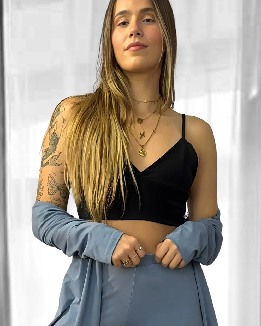 - Versatilidade inteligente: juntas, as peças são um show; separadas, multiplicam seu guarda‑roupa.