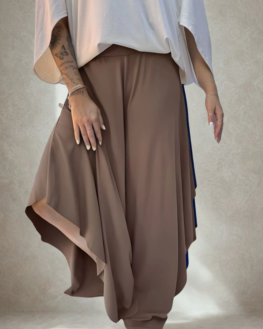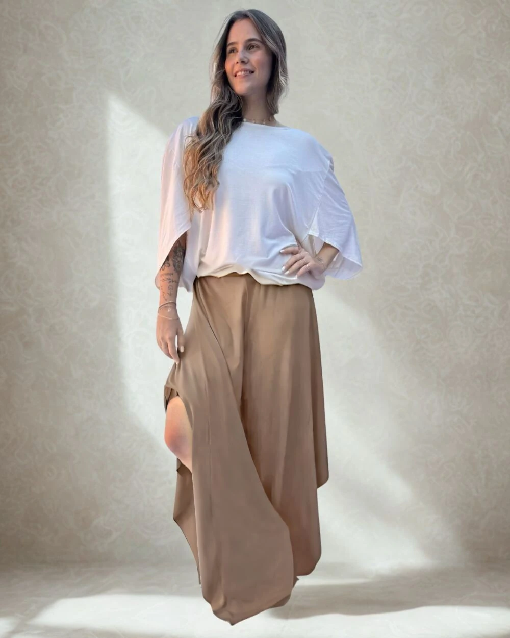 Modelagem Inteligente: A calça possui um design inovador que imita uma saia longa, proporcionando um visual fluido e cheio de movimento.